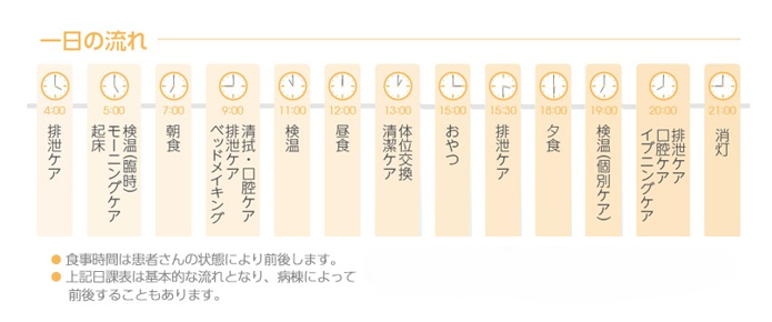 体位変換や排泄ケア等は時間ごと、また個々の病状等に合わせて実施しています。